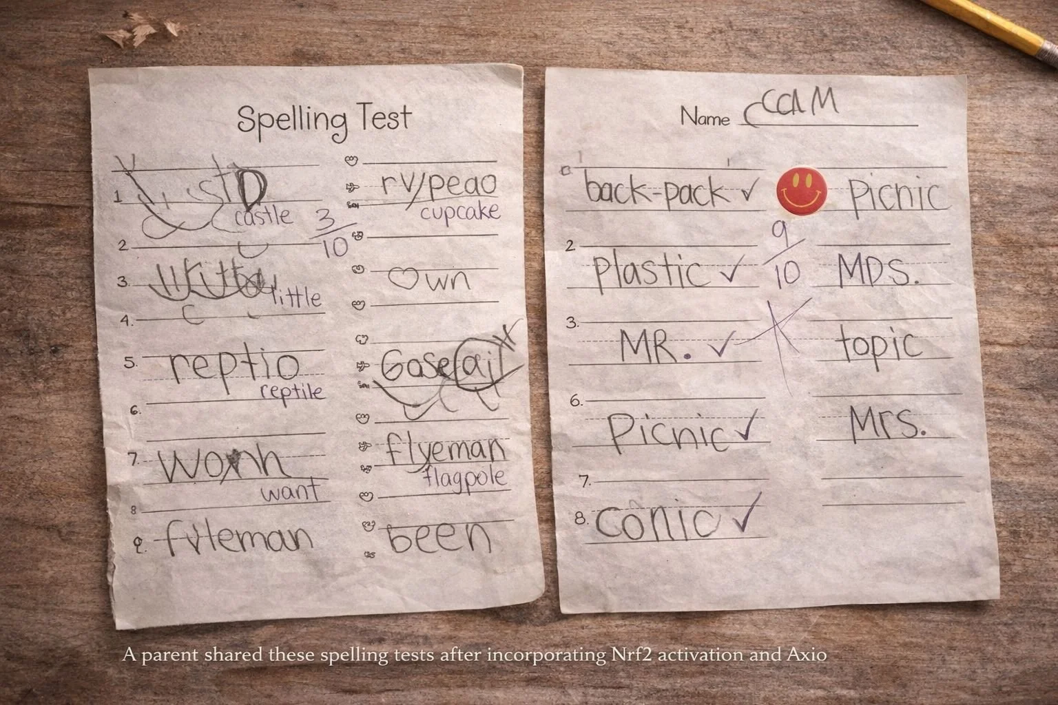 A parent shared these spelling tests after incorporating Nrf2 activation and Axio into their family’s overall wellness routine. Over time, they observed greater clarity and confidence in written expression.