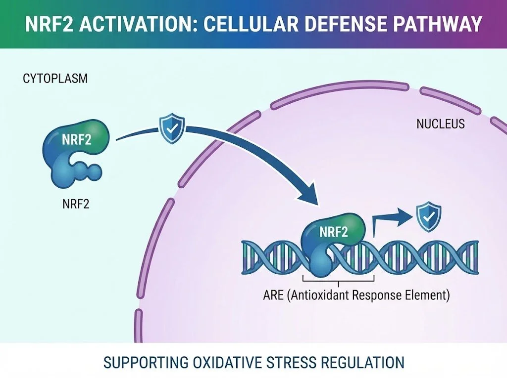 This formulation supports activation of the NRF2 pathway, a key transcription factor involved in regulating antioxidant response and cytoprotective gene expression.